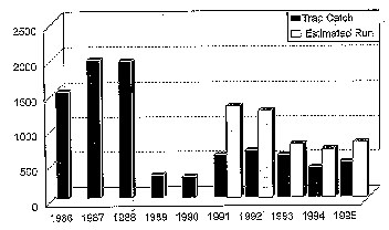 The Service and Department annually have trapped spawning-phase sea lampreys in an average of 6 tributaries since 1986 and estimated the number of spawning lampreys in Cattaraugus Creek during 1991-95 (Fig. 5). Current catches are significantly less than those prior to the start of lampricide management (first round of treatments conducted in 1986/87 and showed effect in spawner population by 1989) but are greater than 10% of pretreatment catches. Since lake trout wounding remains at less than 5%, we are achieving sea lamprey objectives in the lake.
