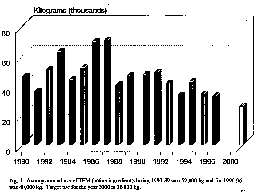 Since the beginning of the use of lampricide in the management program, the Service and Department continually have increased their efficiency in the use of TFM. The combination of improved analytical, application, and assessment techniques, and construction of barriers has reduced the use of TFM for the period of 1990-96 (annual avg. of 40,000 kg) when compared to 1980-89 (annual avg. of 52,000 kg) (Fig. 1). This decrease has occurred despite the addition of streams to the treatment program with high TFM requirements due to high pH and total alkalinity.