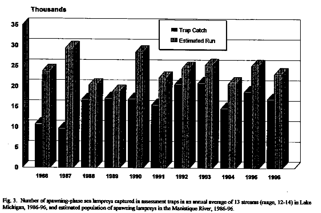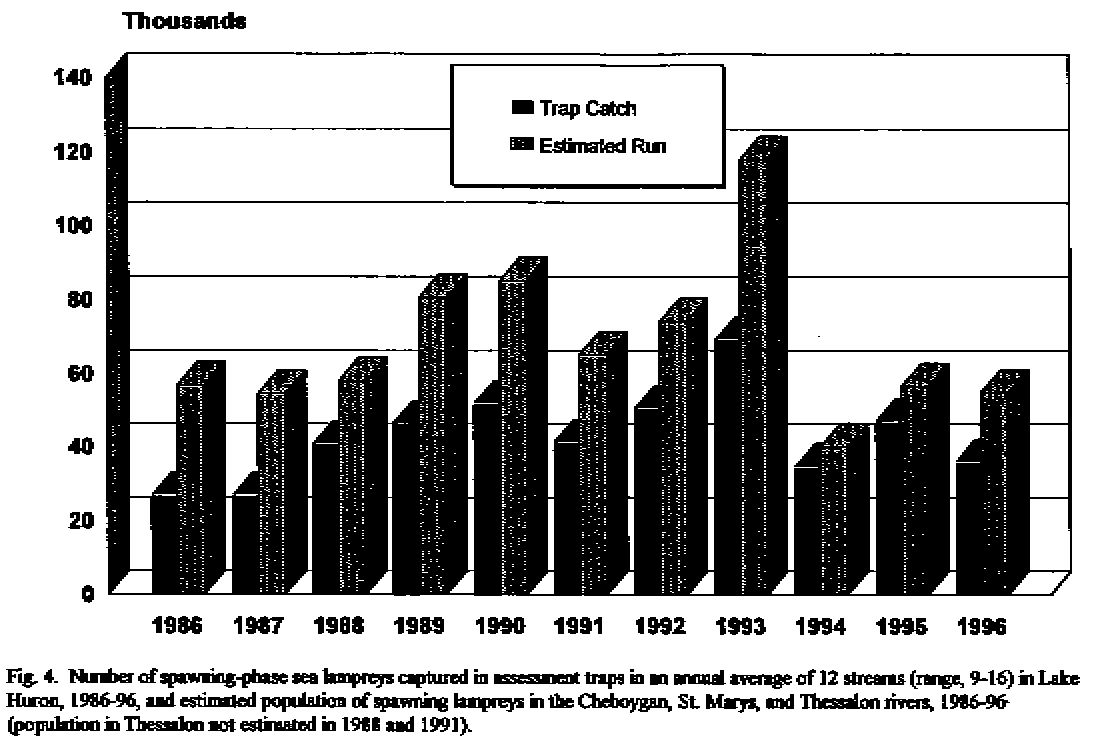 The Service and Department annually have trapped an average of 12 streams during 1986-96 to monitor abundance of sea lampreys in northern Lake Huron. During this period, abundance of lampreys generally increased but declined in 1994-96 (Fig. 4). These trap catches indicate an excessive number of sea lampreys in Lake Huron and the data are substantiated by similar patterns in indices of parasitic sea lamprey abundance and fish wounding. We suggest that without continued substantive action to manage the presently uncontrolled population of larvae in the St. Marys River we will fail to make progress in achieving sea lamprey objectives for lake trout rehabilitation in Lake Huron.