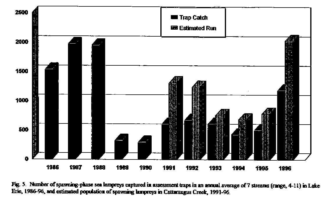 The Service and Department annually have trapped spawning-phase sea lampreys in an average of seven tributaries since 1986 and estimated the number of spawning lampreys in Cattaraugus Creek during 1991-96 (Fig. 5). Current catches are significantly less than those prior to the start of lampricide management (started in 1986 and showed effect in spawner population in 1989) but are greater than 10 percent of pretreatment catches. The population remained stable from 1991-95 and increased in 1996. Wounding of lake trout measured in the fall of 1995 was 5.2 percent (wounding by lampreys spawning in 1996).