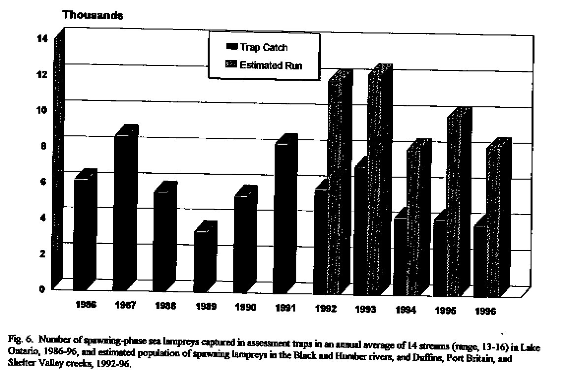 The Service and Department annually have operated traps for spawning-phase sea lampreys in an average of 14 tributaries of Lake Ontario since 1986. In addition, the population of spawning lampreys was estimated for the Black and Humber rivers, and Duffins, Port Britain, and Shelter Valley creeks for 1992-96 (Fig. 6). During that period, catches have remained stable and have ranged from 4,000 to 8,000 annually.
