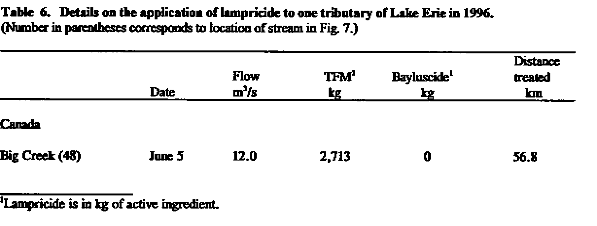 Table 5 provides details of the application of lampricides to 18 tributaries